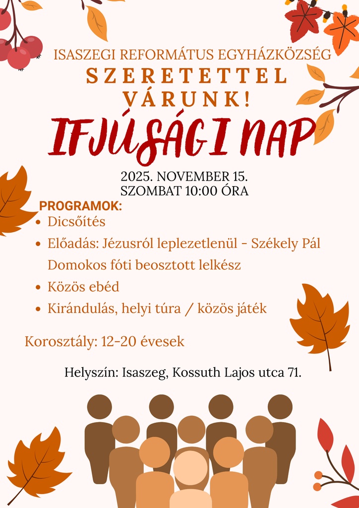 2025. november 15-én, szombaton ifjúsági nap került megrendezésre a gyülekezeti teremben a mellékelt plakáton látható programokkal. A bibliai téma az emmausi tanítványok és Jézus találkozásának a története és feldolgozása volt. Meghívott előadóként Székely Pál Domokos fóti beosztott lelkész tartott előadást. A résztvevő fiatalok az éneklésekkel és játékokkal tarkított foglalkozáson nagyon jól érezték magukat. Az összejövetelen készült fotók ide kattintva nézhetők meg.