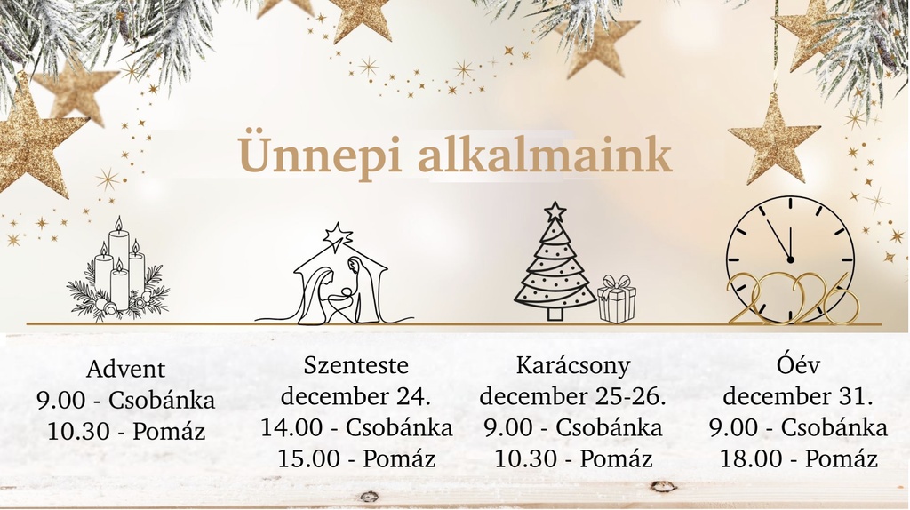 10.30 karácsonyi ünnepi istentisztelet úrvacsorai közösségben Pomázon. Közöttünk szolgál gyülekezetünk Psalmus Kórusa.